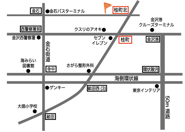 クルーズターミナルより金石方面に進む→桂町交差点を右折